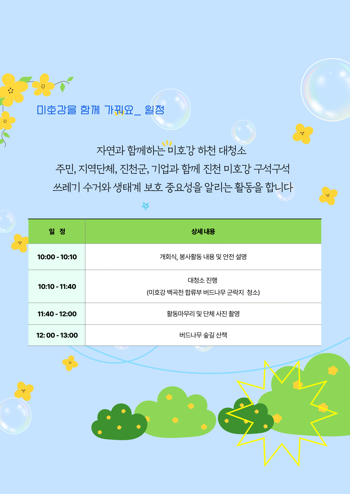 주민, 지역단체, 진천군, 기업과 함께하는 대청소로 진천 미호강의 구석구석 쓰레기를 줍고 미호강 버드나무 숲길을 산책하려 합니다.