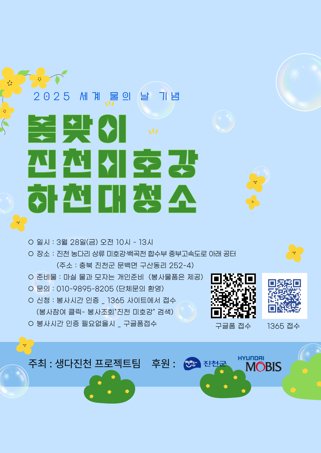 세계 물의 날을 기념하여 봄맞이 진천 미호강 하천 대청소를 합니다.