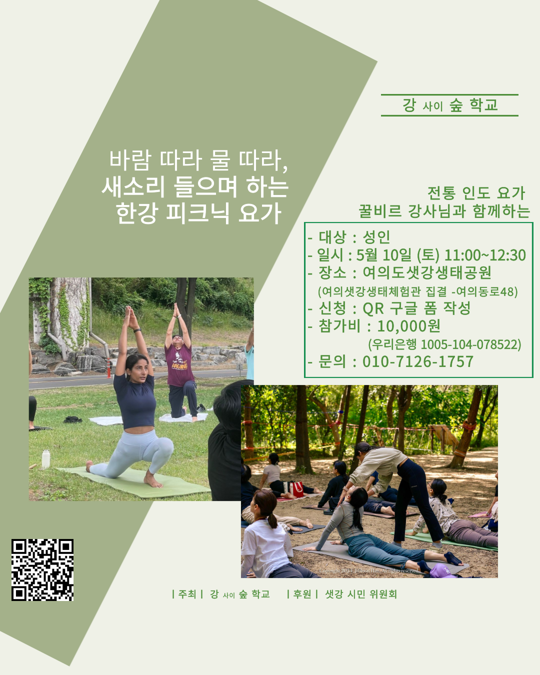 여의도 샛강 생태공원의 맑은 공기와 한강의 시원한 바람을 맞으며 몸과 마음을 힐링하는 요가 클래스가 열립니다.