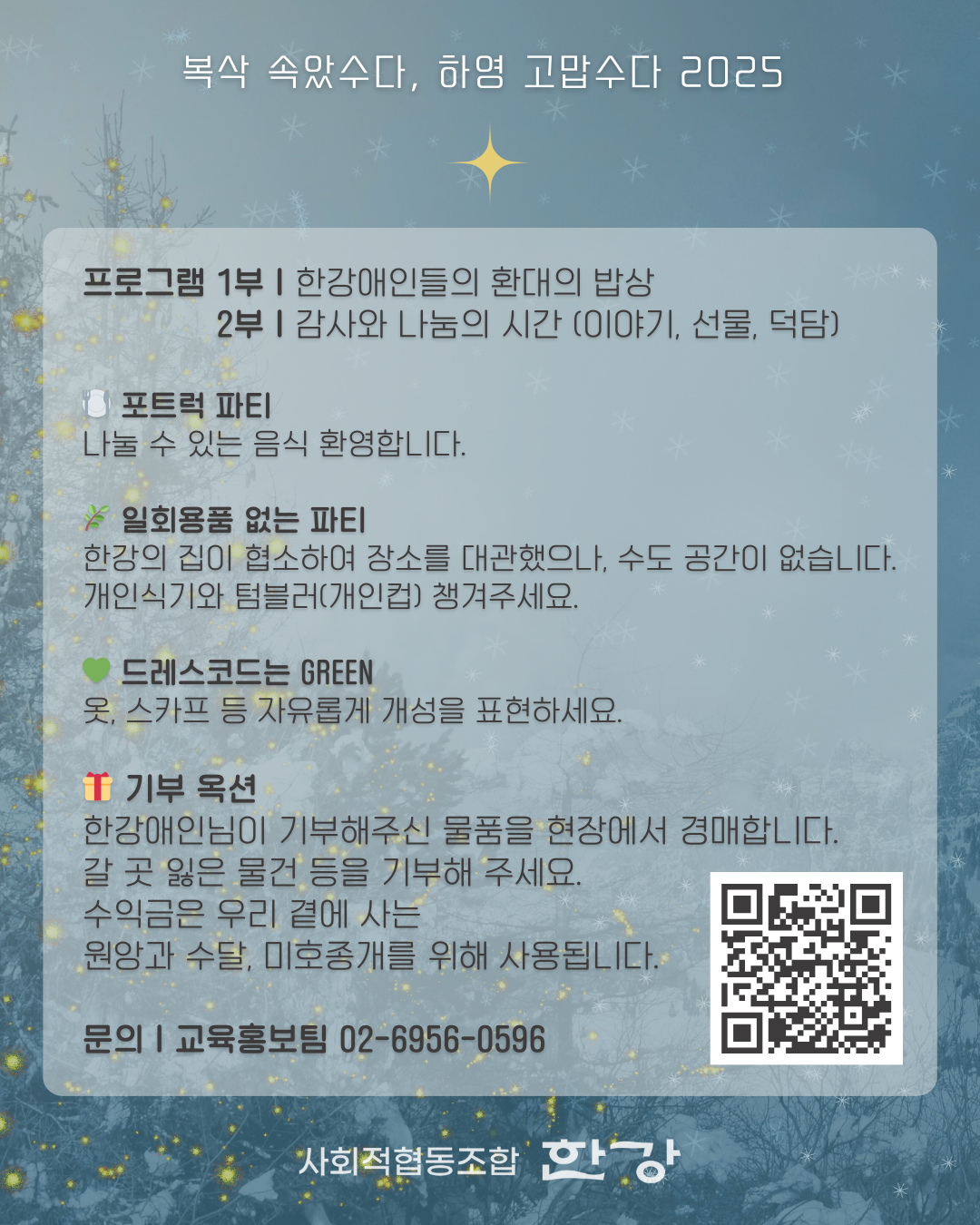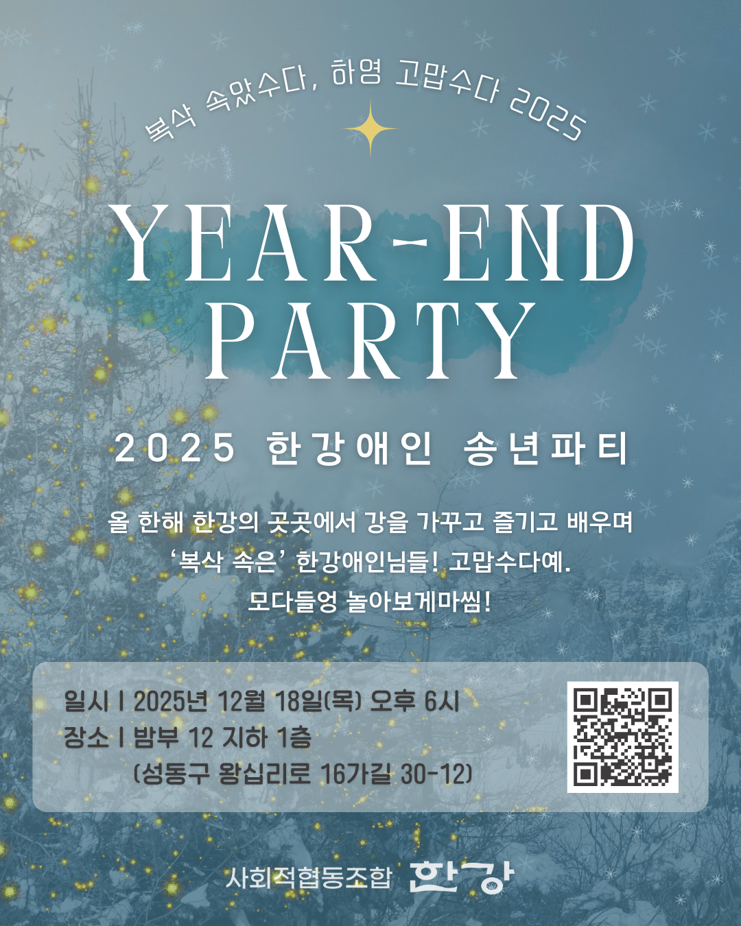 올 한 해, 한강에서 함께 웃고 배운 마음을 나누는 송년 파티가 열립니다. 한강애인 선생님들과 한 해를 마무리하며 따뜻한 밥상과 이야기를 나누고 싶습니다. 초록 드레스코드로 오셔서, 즐겁게 놀아보게마씸!2025 한강애인 송년파티 일시: 2025년 12월 18일(목) 오후 6시 장소: 밤부 12 지하 1층(성동구 왕십리로 16가길 30-12)