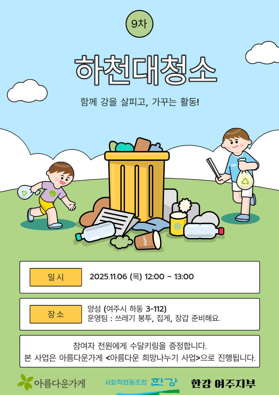 여강의 건강한 생태·문화적 가치에 관심 있는 시민과 단체 누구나 함께할 수 있습니다.장갑, 집게, 쓰레기 봉투는 현장에서 준비되어 있습니다.